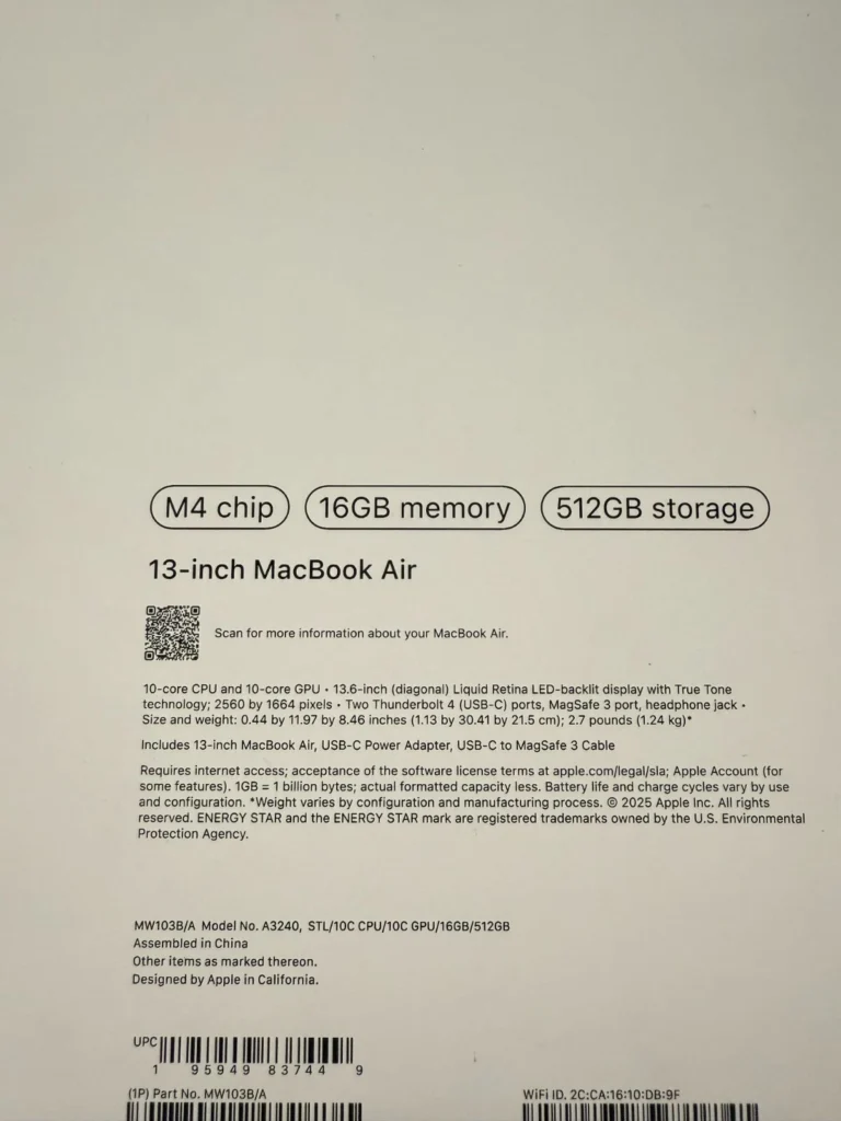 Apple MacBook Air 13 Inch M4 16GB RAM 512GB SSD 2025