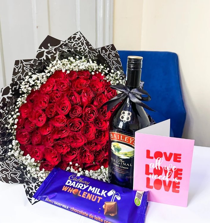 Embrace romance and elegance with this stunning arrangement of deep red roses, gracefully accented by soft white Gypsophila. The contrast of velvety crimson petals with delicate, cloud-like blossoms evokes a classic and enchanting charm, an ideal choice for anniversaries, Valentine’s Day, or special celebrations. Paired with a silky 750ml bottle of Bailey’s milk wine and a timeless Cadbury chocolate bar, this gift set blends floral beauty, creamy indulgence, and chocolate sweetness. A thoughtful expression of love that conveys emotion without a single word.