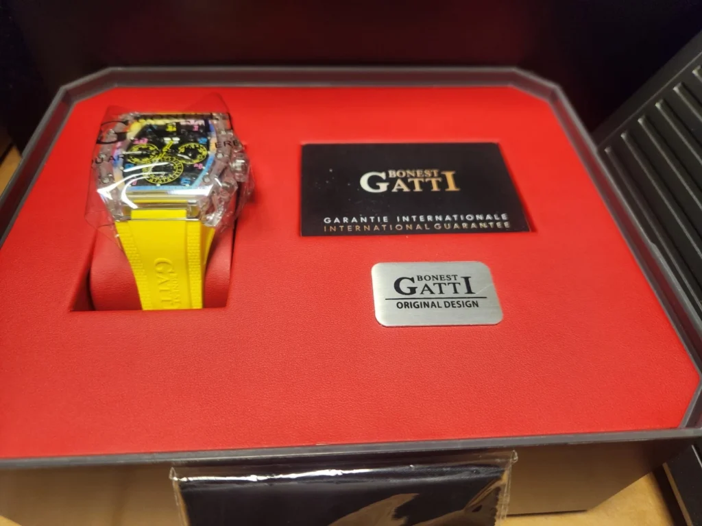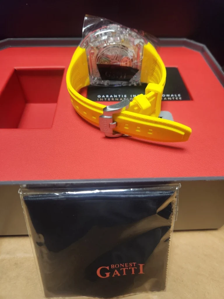 The BONEST GATTI 9980 is a bold and luxurious timepiece that stands out with its skeleton dial and tonneau-shaped crystal case. Designed for those who appreciate both modern aesthetics and mechanical precision, this watch features a self-winding automatic movement with 24 jewels, visible through its exhibition caseback. The yellow rubber strap and matching dial details add a striking pop of color, while the sapphire crystal ensures scratch resistance and clarity. With a 50m water resistance rating, it is as practical as it is stylish.