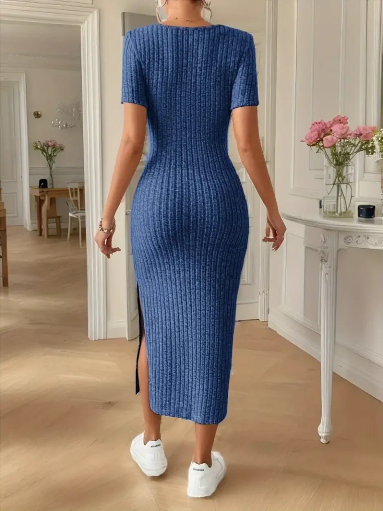 Chic Blue Elegant Bodycon Midi Dress for Women | Ribbed Knit