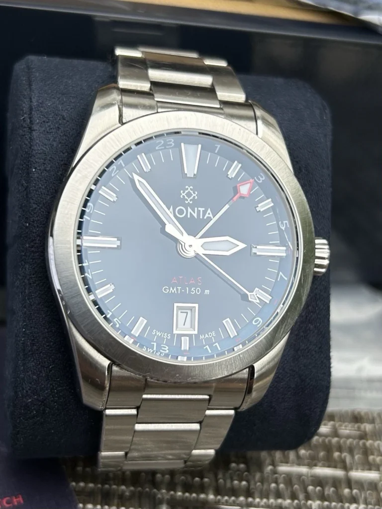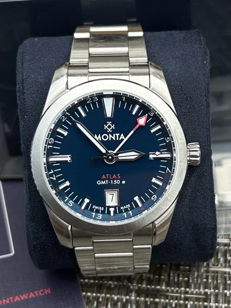 The Monta Atlas GMT is a precision-crafted Swiss timepiece designed for the modern traveler and watch enthusiast. Featuring a 38mm stainless steel case, a striking blue dial, and a GMT function for dual time zones, this watch combines luxury with practicality. With 150m (15 ATM) water resistance, a robust automatic movement, and a high-quality stainless steel bracelet, the Atlas GMT is built for both adventure and style.